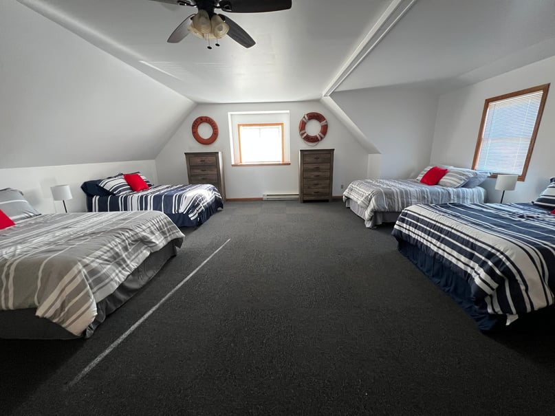 2 bedrooms, one "bunk style room" with 4 full size beds, one with one full size bed